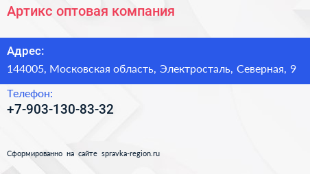 Артикс, оптовая компания по адресу 144005, Московская область, Электросталь, Северная, 9 в дальнейшем Организация, размещена в следующих категориях: