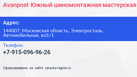 Avanpost Южный, шиномонтажная мастерская по адресу 144007, Московская область, Электросталь, Автомобильная, вл1/1 в дальнейшем Организация, размещена в следующих категориях: