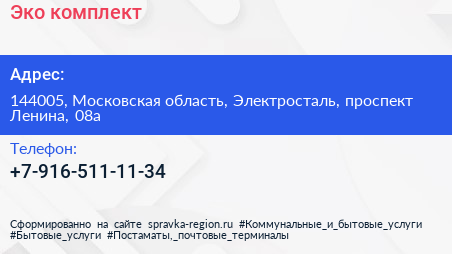 Эко комплект по адресу 144005, Московская область, Электросталь, проспект Ленина, 08а в дальнейшем Организация, размещена в следующих категориях: