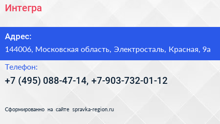 Интегра по адресу 144006, Московская область, Электросталь, Красная, 9а в дальнейшем Организация, размещена в следующих категориях: