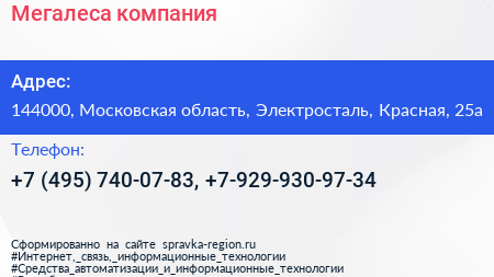 Мегалеса, компания по адресу 144000, Московская область, Электросталь, Красная, 25а в дальнейшем Организация, размещена в следующих категориях: