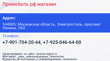 Промебель.рф, магазин по адресу 144005, Московская область, Электросталь, проспект Ленина, 010 в дальнейшем Организация, размещена в следующих категориях: