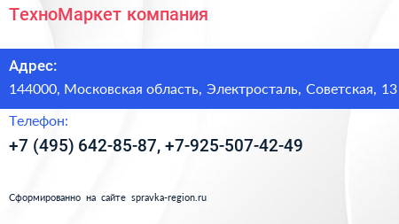 ТехноМаркет, компания по адресу 144000, Московская область, Электросталь, Советская, 13 в дальнейшем Организация, размещена в следующих категориях:
