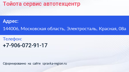 Тойота сервис, автотехцентр по адресу 144006, Московская область, Электросталь, Красная, 08а в дальнейшем Организация, размещена в следующих категориях: