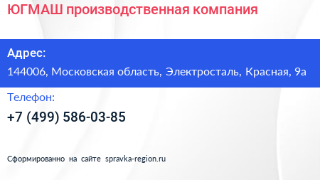 ЮГМАШ, производственная компания по адресу 144006, Московская область, Электросталь, Красная, 9а в дальнейшем Организация, размещена в следующих категориях: