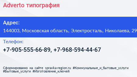 Adverto, типография по адресу 144003, Московская область, Электросталь, Николаева, 29 в дальнейшем Организация, размещена в следующих категориях: