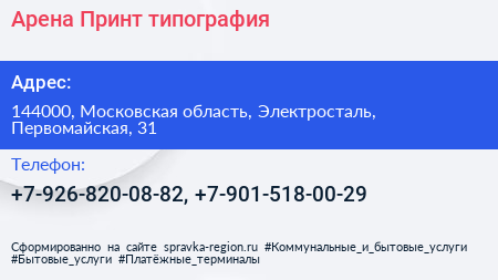 Арена Принт, типография по адресу 144000, Московская область, Электросталь, Первомайская, 31 в дальнейшем Организация, размещена в следующих категориях: