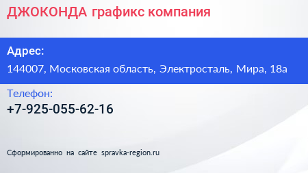 ДЖОКОНДА графикс, компания по адресу 144007, Московская область, Электросталь, Мира, 18а в дальнейшем Организация, размещена в следующих категориях: