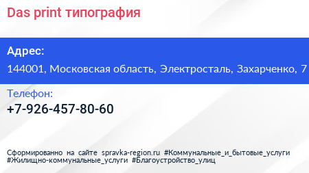 Das-print, типография по адресу 144001, Московская область, Электросталь, Захарченко, 7 в дальнейшем Организация, размещена в следующих категориях: