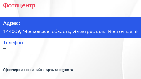 Фотоцентр по адресу 144009, Московская область, Электросталь, Восточная, 6 в дальнейшем Организация, размещена в следующих категориях: