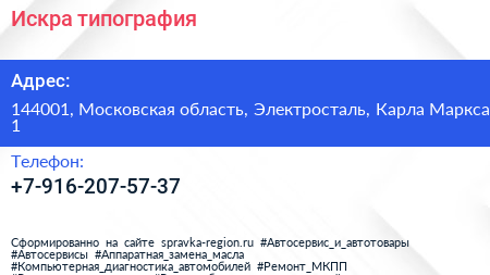 Искра, типография по адресу 144001, Московская область, Электросталь, Карла Маркса, 1 в дальнейшем Организация, размещена в следующих категориях: