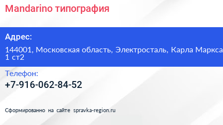 Mandarino, типография по адресу 144001, Московская область, Электросталь, Карла Маркса, 1 ст2 в дальнейшем Организация, размещена в следующих категориях: