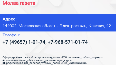 Молва, газета по адресу 144002, Московская область, Электросталь, Красная, 42 в дальнейшем Организация, размещена в следующих категориях: