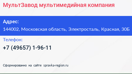 МультЗавод, мультимедийная компания по адресу 144002, Московская область, Электросталь, Красная, 30Б в дальнейшем Организация, размещена в следующих категориях:
