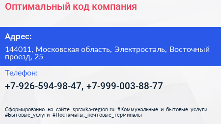 Оптимальный код, компания по адресу 144011, Московская область, Электросталь, Восточный проезд, 25 в дальнейшем Организация, размещена в следующих категориях: