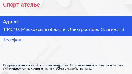Спорт-ателье по адресу 144010, Московская область, Электросталь, Ялагина, 3 в дальнейшем Организация, размещена в следующих категориях: