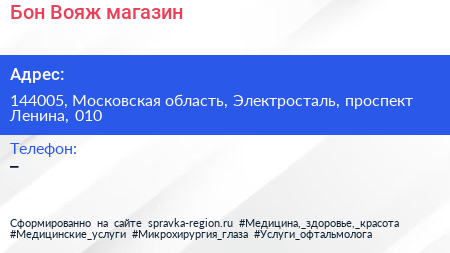 Бон Вояж, магазин по адресу 144005, Московская область, Электросталь, проспект Ленина, 010 в дальнейшем Организация, размещена в следующих категориях:
