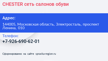 CHESTER, сеть салонов обуви по адресу 144005, Московская область, Электросталь, проспект Ленина, 010 в дальнейшем Организация, размещена в следующих категориях: