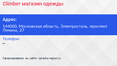 Climber, магазин одежды по адресу 144000, Московская область, Электросталь, проспект Ленина, 27 в дальнейшем Организация, размещена в следующих категориях: