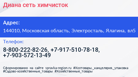 Диана, сеть химчисток по адресу 144010, Московская область, Электросталь, Ялагина, вл5 в дальнейшем Организация, размещена в следующих категориях: