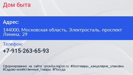 Дом быта по адресу 144000, Московская область, Электросталь, проспект Ленина, 29 в дальнейшем Организация, размещена в следующих категориях: