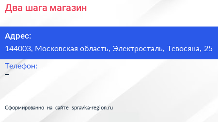Два шага, магазин по адресу 144003, Московская область, Электросталь, Тевосяна, 25 в дальнейшем Организация, размещена в следующих категориях: