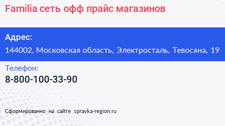 Familia, сеть офф-прайс магазинов по адресу 144002, Московская область, Электросталь, Тевосяна, 19 в дальнейшем Организация, размещена в следующих категориях: