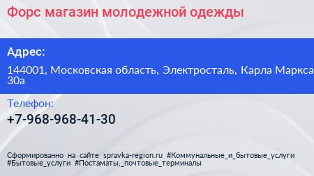 Форс, магазин молодежной одежды по адресу 144001, Московская область, Электросталь, Карла Маркса, 30а в дальнейшем Организация, размещена в следующих категориях: