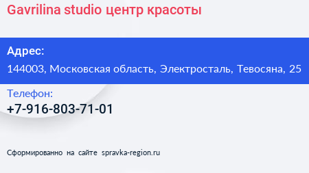 Gavrilina studio, центр красоты по адресу 144003, Московская область, Электросталь, Тевосяна, 25 в дальнейшем Организация, размещена в следующих категориях: