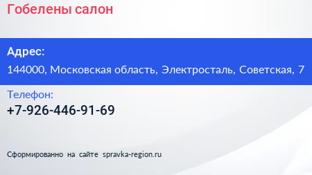 Гобелены, салон по адресу 144000, Московская область, Электросталь, Советская, 7 в дальнейшем Организация, размещена в следующих категориях: