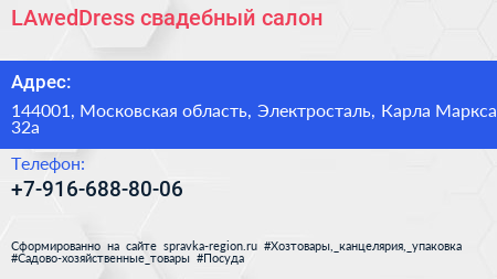 LAwedDress, свадебный салон по адресу 144001, Московская область, Электросталь, Карла Маркса, 32а в дальнейшем Организация, размещена в следующих категориях:
