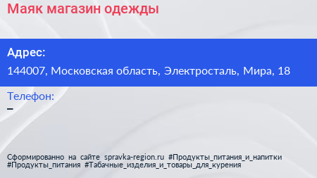 Маяк, магазин одежды по адресу 144007, Московская область, Электросталь, Мира, 18 в дальнейшем Организация, размещена в следующих категориях:
