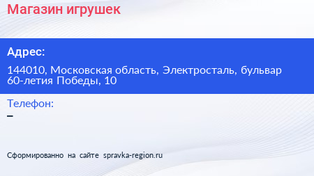 Магазин игрушек по адресу 144010, Московская область, Электросталь, бульвар 60-летия Победы, 10 в дальнейшем Организация, размещена в следующих категориях: