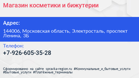 Магазин косметики и бижутерии по адресу 144006, Московская область, Электросталь, проспект Ленина, 3Б в дальнейшем Организация, размещена в следующих категориях: