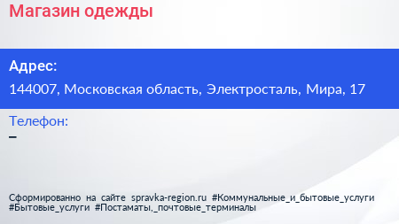 Магазин одежды по адресу 144007, Московская область, Электросталь, Мира, 17 в дальнейшем Организация, размещена в следующих категориях: