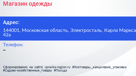 Магазин одежды по адресу 144001, Московская область, Электросталь, Карла Маркса, 42а в дальнейшем Организация, размещена в следующих категориях: