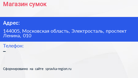 Магазин сумок по адресу 144005, Московская область, Электросталь, проспект Ленина, 010 в дальнейшем Организация, размещена в следующих категориях: