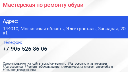 Мастерская по ремонту обуви по адресу 144010, Московская область, Электросталь, Западная, 20 к1 в дальнейшем Организация, размещена в следующих категориях: