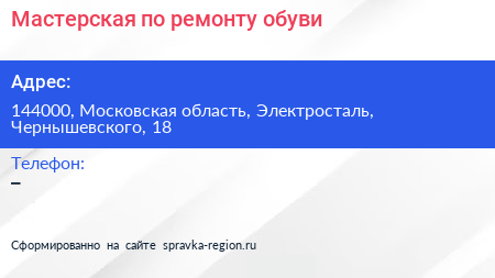 Мастерская по ремонту обуви по адресу 144000, Московская область, Электросталь, Чернышевского, 18 в дальнейшем Организация, размещена в следующих категориях: