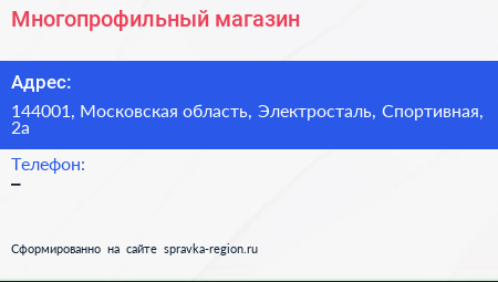 Многопрофильный магазин по адресу 144001, Московская область, Электросталь, Спортивная, 2а в дальнейшем Организация, размещена в следующих категориях: