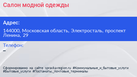 Салон модной одежды по адресу 144000, Московская область, Электросталь, проспект Ленина, 29 в дальнейшем Организация, размещена в следующих категориях: