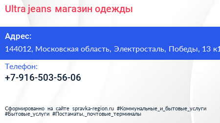 Ultra jeans, магазин одежды по адресу 144012, Московская область, Электросталь, Победы, 13 к1 в дальнейшем Организация, размещена в следующих категориях: