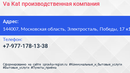 Va & Kat, производственная компания по адресу 144007, Московская область, Электросталь, Победы, 17 к1 в дальнейшем Организация, размещена в следующих категориях: