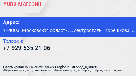 Yuna, магазин по адресу 144003, Московская область, Электросталь, Корешкова, 3 в дальнейшем Организация, размещена в следующих категориях: