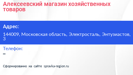 Алексеевский, магазин хозяйственных товаров по адресу 144009, Московская область, Электросталь, Энтузиастов, 3 в дальнейшем Организация, размещена в следующих категориях: