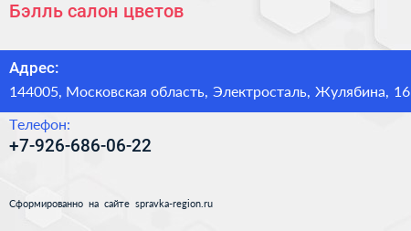 Бэлль, салон цветов по адресу 144005, Московская область, Электросталь, Жулябина, 16 в дальнейшем Организация, размещена в следующих категориях: