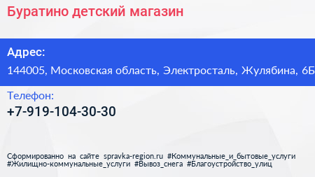 Буратино, детский магазин по адресу 144005, Московская область, Электросталь, Жулябина, 6Б в дальнейшем Организация, размещена в следующих категориях: