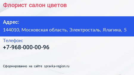 Флорист, салон цветов по адресу 144010, Московская область, Электросталь, Ялагина, 5 в дальнейшем Организация, размещена в следующих категориях: