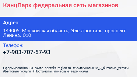 КанцПарк, федеральная сеть магазинов по адресу 144005, Московская область, Электросталь, проспект Ленина, 010 в дальнейшем Организация, размещена в следующих категориях: