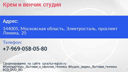 Крем и венчик, студия по адресу 144005, Московская область, Электросталь, проспект Ленина, 25 в дальнейшем Организация, размещена в следующих категориях: